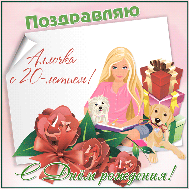 Открытка Аллочке на 20 лет с собачками, подарками и розами.