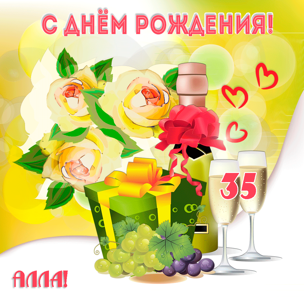 Поздравительная открытка Алле на 35 лет с шампанским и бокалами.
