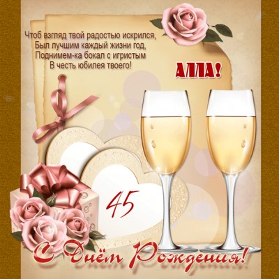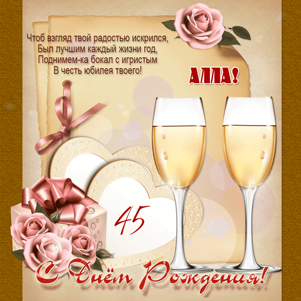 Гифка к 45-летию Алле с бокалами шампанского и поздравлением в стихах.