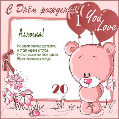 С 20-летним юбилеем Алле открытка с мишкой и шарами в форме сердечек.